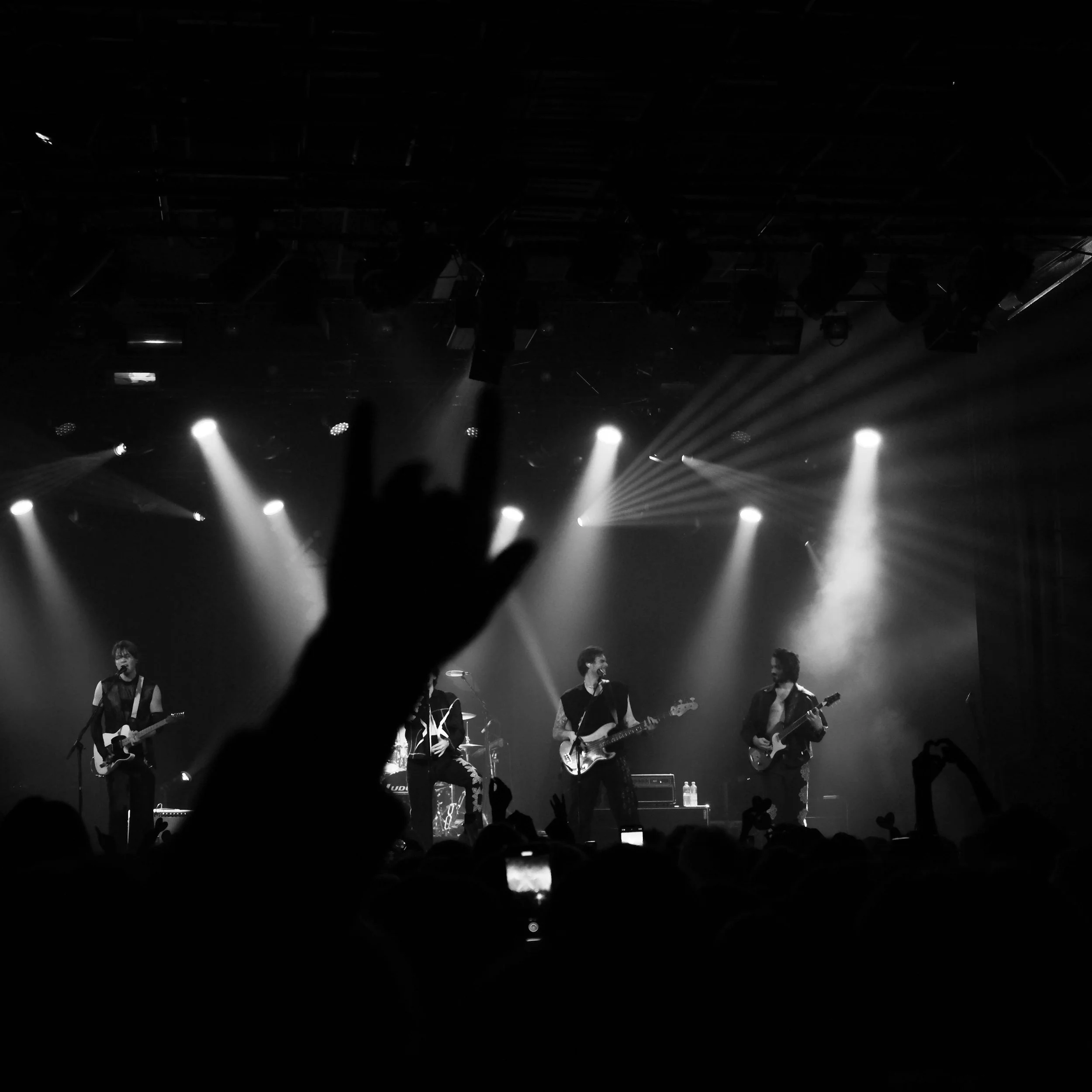 Silhouette of a person with arms raised in front of a colorful, purple-hued background at a concert or event.